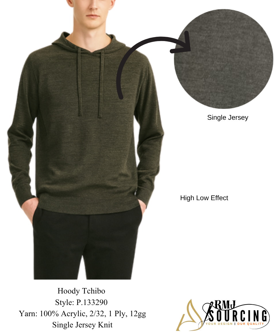 Crafted from 100% acrylic yarn with a 2/32, 1-ply, 12-gauge construction, it offers a smooth and flexible drape that feels comfortable against the skin. The single jersey knit provides a clean, fine finish, while the high-low effect adds subtle depth and texture to the fabric.